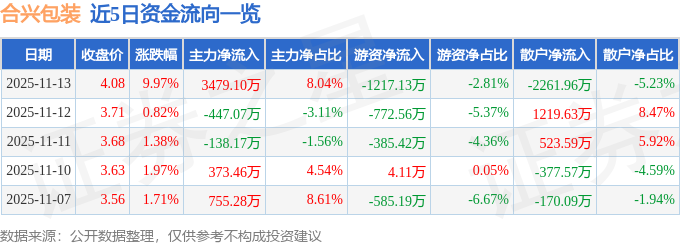 证券之星音讯,到2025年11月13日收盘,合兴包装(002228)报收于4.08元,上涨9.97%,涨停,换手率9.12%,成交量110.3万手,成交额4.33亿元。